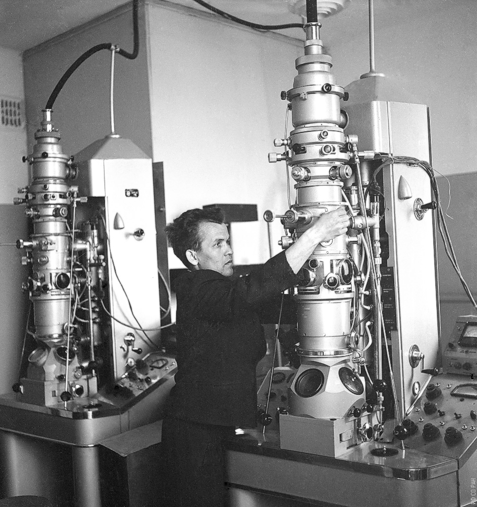 Сивков Николай Иванович, научный сотрудник в лаборатории физики магнитных явлений Института физики им. Л.В. Киренского Сибирского отделения Академии наук СССР (ИФ СО АН СССР, за работой на электронном микроскопе ЭМ-7, фото 1971 года. Красноярск.