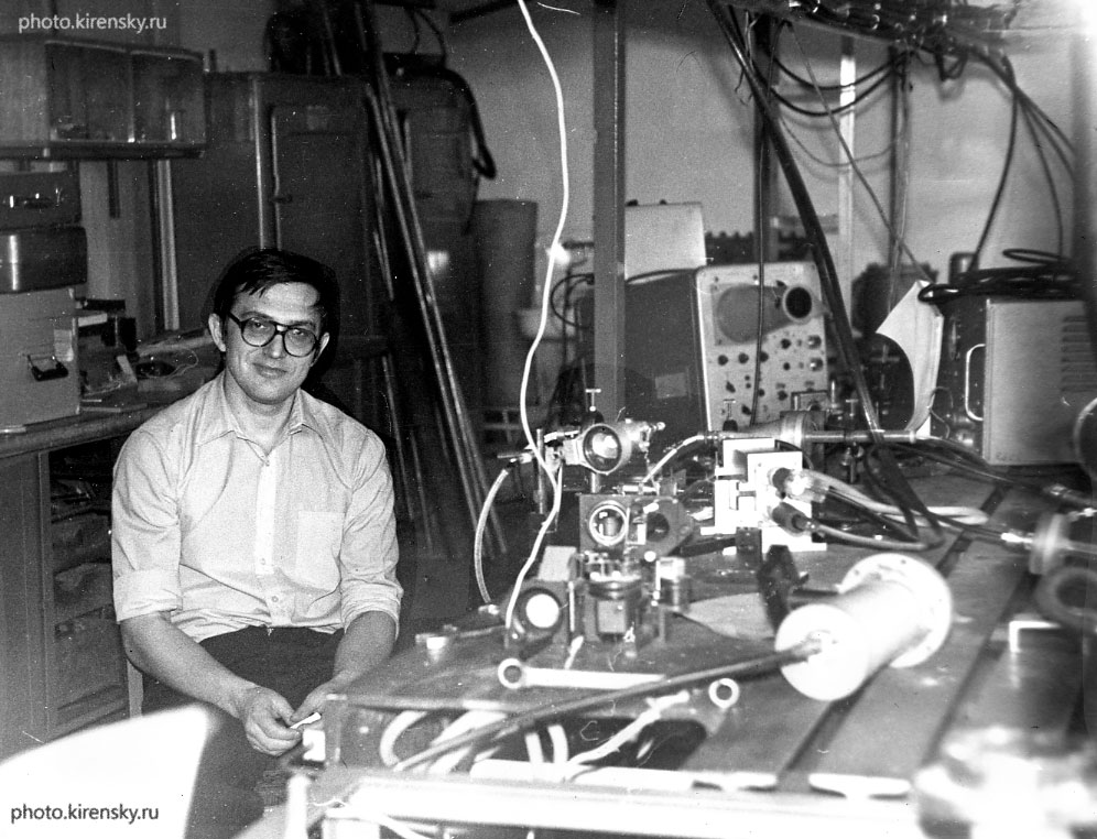1981 год. На снимке сотрудники лаборатории когерентной оптики Института физики им. Л.В. Киренского Сибирского отделения Академии наук СССР (ИФ СО АН СССР). В первом ряду сидят (слева направо): Архипкин В.Г., Кодиров М.К., Мелкозерова Л.В., Тимофеев В.П., Попов А.К..- заведующий лабораторией, Перцева Л.В. В среднем ряду (слева направо): Подавалова О.П., Садовничий А.Е., Мысливец С.А., Лукиных В.Ф., Эпштейн В.Ш., Кияшко В.А., Слабко В.В, Им Тхек Де. В третьем ряду (слева направо): Болотских Л.Т., Высотин А.Л., Макаров Н.П., Александровский А.С. Красноярск.