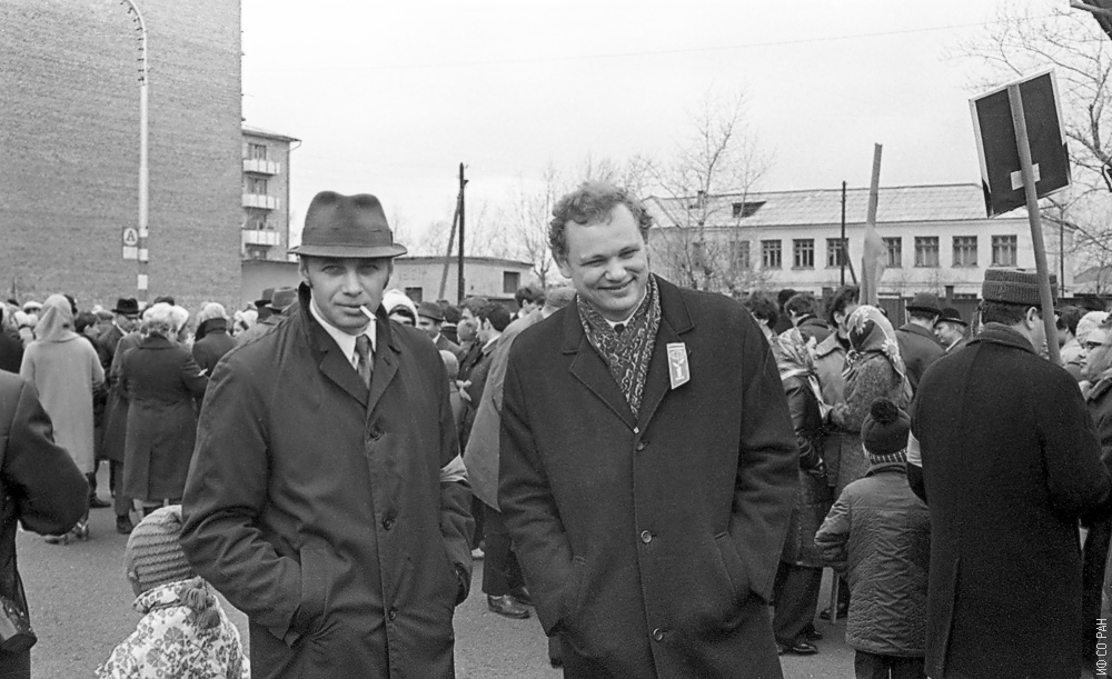 Смолин Р. П. (слева) и Петров Н. И., сотрудники Института физики им. Л.В. Киренского Сибирского отделения Академии наук СССР (ИФ СО АН СССР), на первомайской демонстрации трудящихся города Красноярска в 1974 году.
