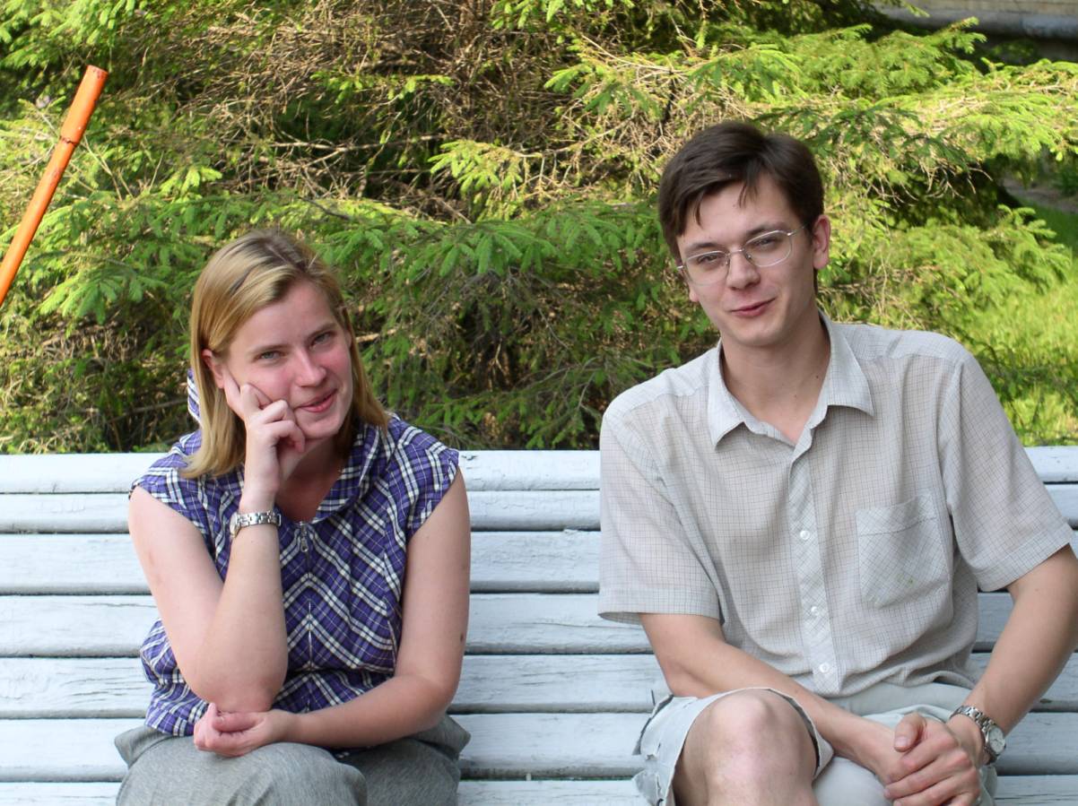 Председатель Совета молодых ученых Красноярского научного центра Софронова Светлана Николаевна и Новиков Павел Вадимович, научный сотрудник лаборатории аналитических методов исследования вещества Института физики им. Л.В. Киренского Сибирского отделения Российской академии наук (ИФ СО РАН), у здания Института физики в июле 2005 года.