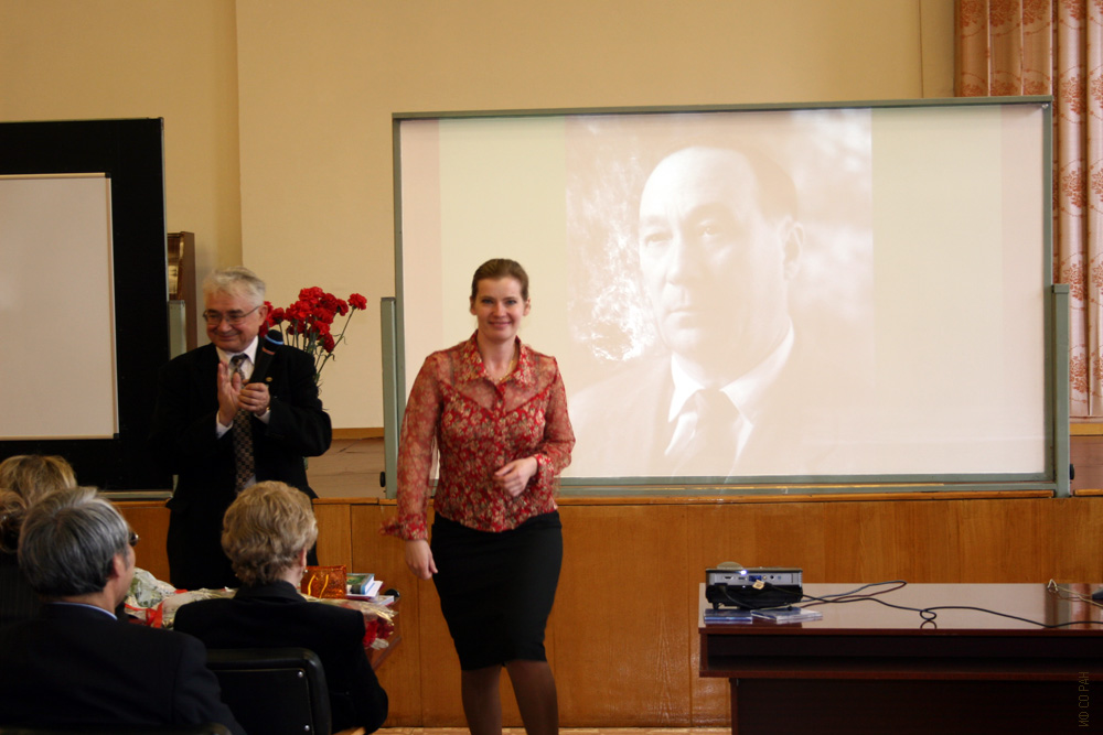 Со словами благодарности к старшему поколению, сохранившему традиции академика Л.В. Киренского, обращается председатель Совета научной молодежи Красноярского научного центра СО РАН, Светлана Николаевна Софронова, старший научный сотрудник лаборатории кристаллофизики Института физики им. Л.В.Киренского Сибиоского отделения Российской академии наук (ИФ СО РАН), 9 апреля 2009 г. Красноярск.