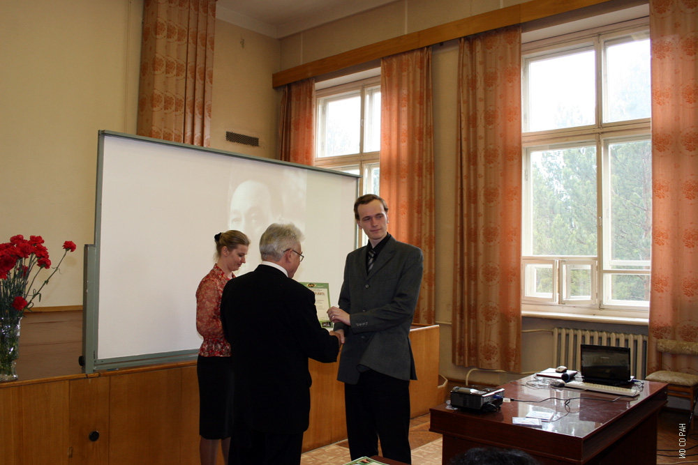 Директор Института физики им. Л.В. Киренского Сибирского отделения Российской академии наук (ИФ СО РАН) академик В.Ф.Шабанов вручает почетную грамоту победителю ежегодного конкурса-конференции молодых ученых Красноярского научного центра СО РАН (в 2009 году посвященного 100-летию Киренского). Слева от Шабанова С.Н. Сафронова. Красноярск.