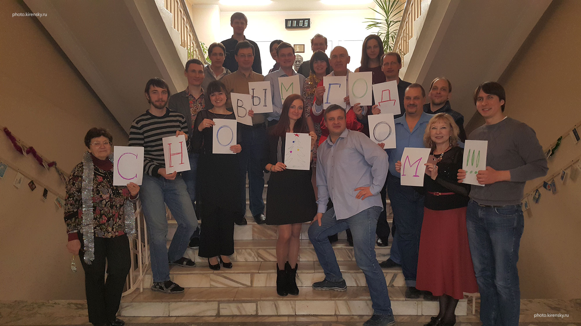 Встреча Нового года сотрудниками лаборатории физики магнитных явлений Института физики им. Л.В. Киренского Сибирского отделения Российской академии наук. Слева направо: ?, Соколов Алексей Эдуардович, Иванова Оксана Станиславовна, Бруштунова Ольга Николаевна, Овчинников Сергей Геннадьевич, Гохфельд Юлия Сергеевна. Сидят: Федоров Александр Семенович (слева), Александровский Александр Сергеевич. 29 декабря 2022 года