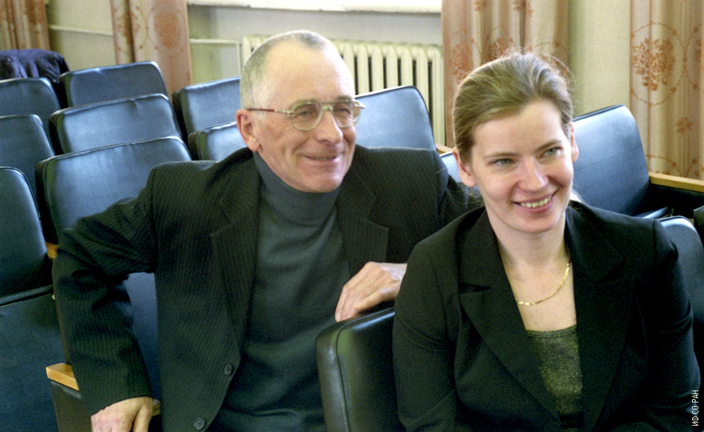 1993 год. Актовый зал Института физики им. Л.В. Киренского Сибирского отделения Российской академии наук (ИФ СО РАН). Заседание диссертационного совета. Вопрос задает Петраковский Г.А. Во втором ряду, крайний слева - Зиненко В.И., ведущий научный сотрудник лаборатории кристаллофизики ИФ. Красноярск.