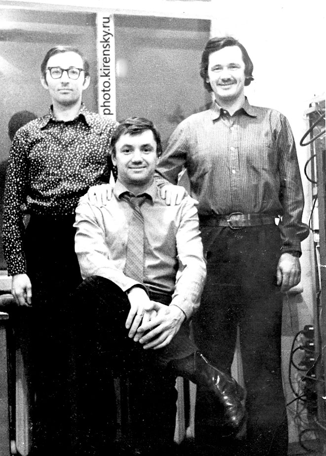 1974 год. Сотрудники лаборатории резонансных свойств магнитоупорядоченных веществ Института физики им. Л.В. Киренского Сибирского отделения Академии наук СССР (ИФ СО АН СССР) Соснин В.М. (слева), сидит – Панкрац А.И., Васильев В.Н. Красноярск.