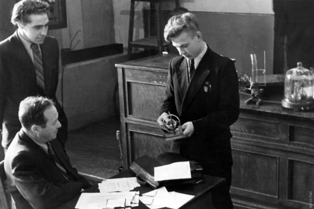 с молодыми ассистентами кафедры физики и основ производства Красноярского государственного педагогического института. Леонид Васильевич, возглавив Институт физики не оставил педагогическую деятельность. Подготовка к лекциям с молодыми ассистентами. Стоят: Д.А. Лаптей (слева) и В.П. Спиридонов.
