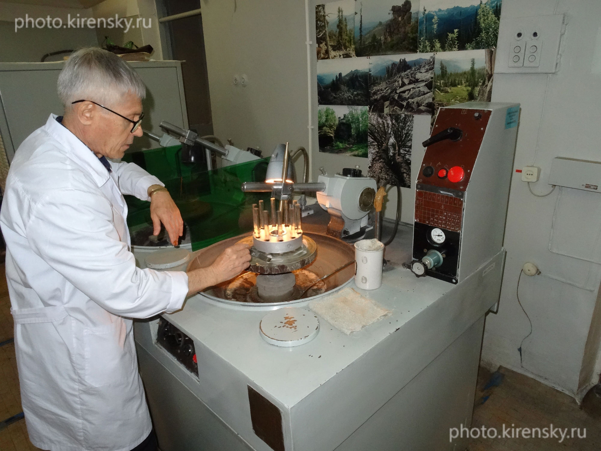 2019 год. Свентитский Владимир Михайлович, сотрудник Института физики им. Л.В. Киренского Сибирского отделения Российской академии наук ( ИФ СО РАН), занят полировкой оптических стекол, предназначенных для использования в экспериментальной лазерной установке лаборатории Научного приборостроения.