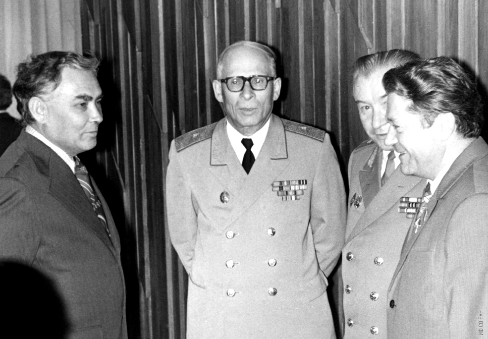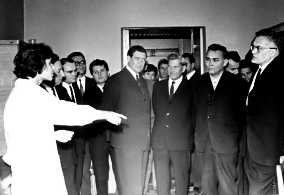 1974 год. Во время визита в Красноярск академик М.А. Лаврентьев (второй справа) посетил лабораторию биофизики Института физики им. Л.В. Киренского Сибирского отделения Академии наук СССР. Третий слева - И.А.Терсков, директор Института физики.