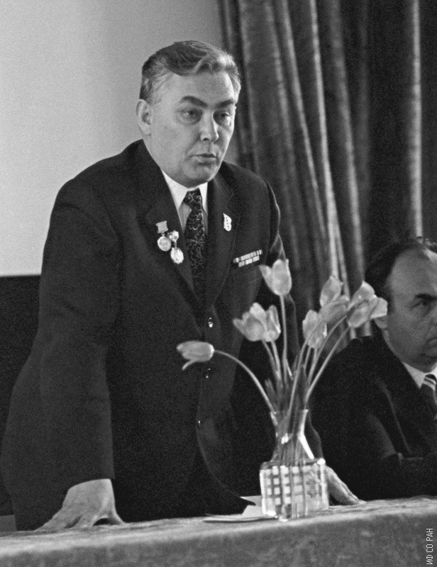 Директор Института физики им. Л.В. Киренского Сибирского отделения Академии наук СССР (ИФ СО АН СССР) Терсков Иван Александрович открывает торжественное заседание, посвященное 30-летию Победы в Великой Отечественной войне (1941-1945 гг.), 1975 год. Красноярск.