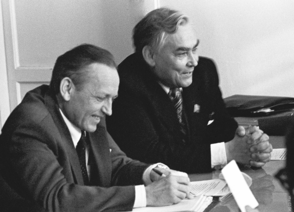 На снимке председатель Президиума Сибирского отделения Академии наук СССР В.А. Коптюг (слева) во время визита в Красноярск и директор Института физики им. Л.В.Киренского Сибирского отделения Академии наук СССР И.А.Терсков. Снимок 1981 года. Красноярск.