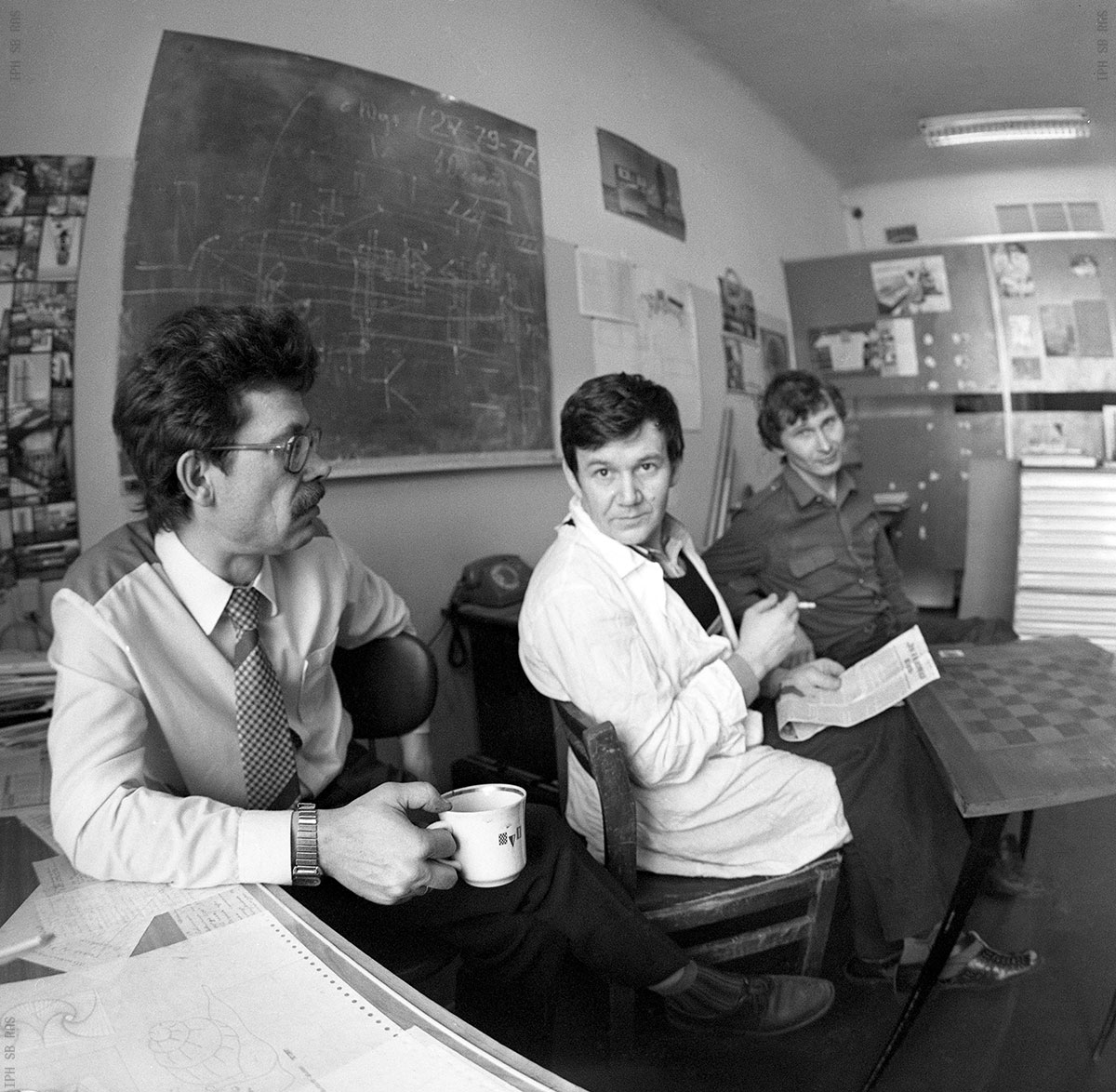 1984 год. Сотрудники лаборатории радиоспектроскопического структурного анализа Института физики им. Л.В. Киренского Сибирского отделения Академии наук СССР (ИФ СО АН СССР), слева направо: Г.Ф. Лыбзиков, В.В. Меньшиков и С.А. Трофимов. Красноярск.