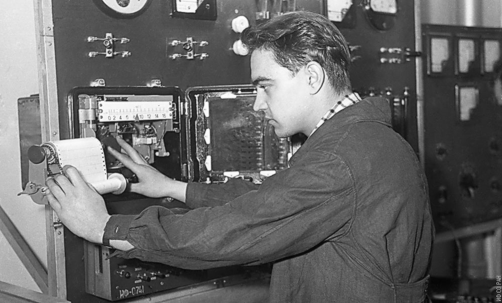 Тропин Ю.Д., младший научный сотрудник лаборатории магнетизма горных пород и геофизики Института физики Сибирского отделения Академии наук СССР (ИФ СО АН СССР). Фото 1963 года. Красноярск.