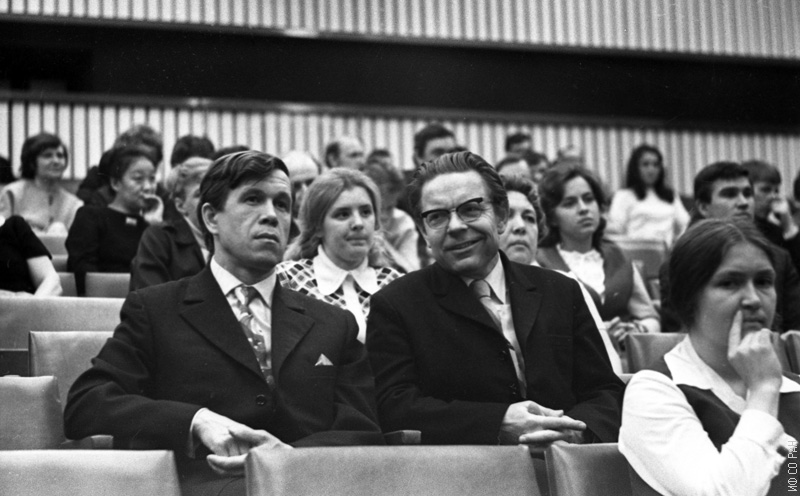 Кочаров Н. Г. (слева) и Трубачев И. Н., сотрудники Института физики им. Л.В. Киренского Сибирского отделения Академии наук СССР (ИФ СО АН СССР), в актовом зале Красноярского научного центра СО АН СССР на собрании, посвященном 250-летию образования Академии наук СССР, фото 1975 года.