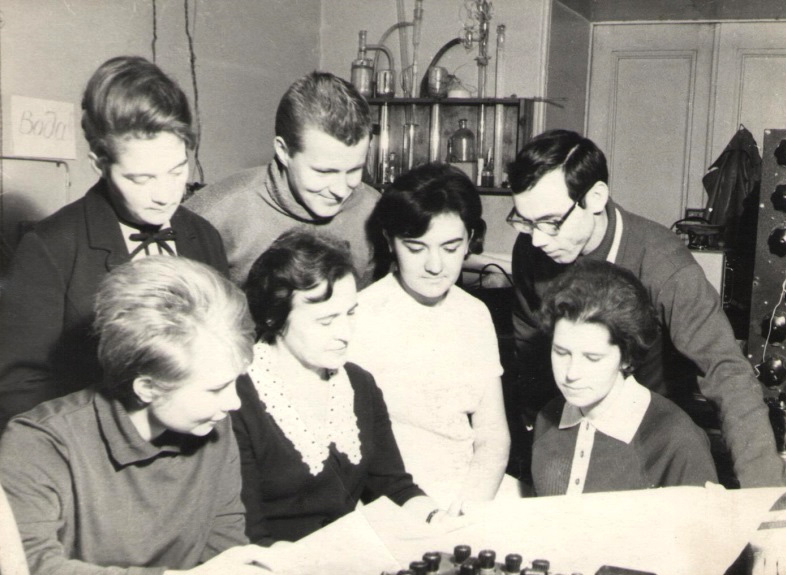 Студенты радиофизического факультета Томского государственного университета им. В.В. Куйбышева. Сидит - профессор Сапожников. Средний ряд: крайний слева Эдуард Лещев, ?, ?, ?, Владимир Усков и Владимир Бержанский. Верхний ряд: Игорь Пухов (слева) и Олег Баюков. Снимок 1961 года. Томск.