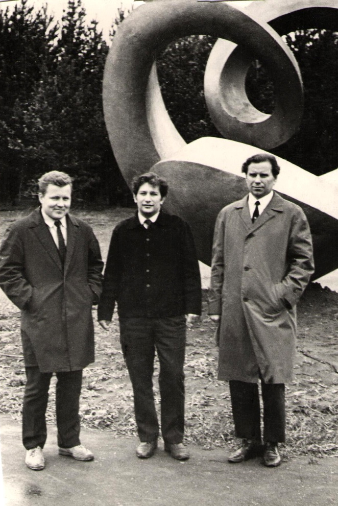 Сотрудники Института физики им. Л.В. Киренского Сибирского отделения Академии наук СССР (ИФ СО АН СССР) у здания института в Академгородке Красноярска. Слева направо: Усков В.В., Бержанский В.Н., гость МГУ. Снимок 1976 года.