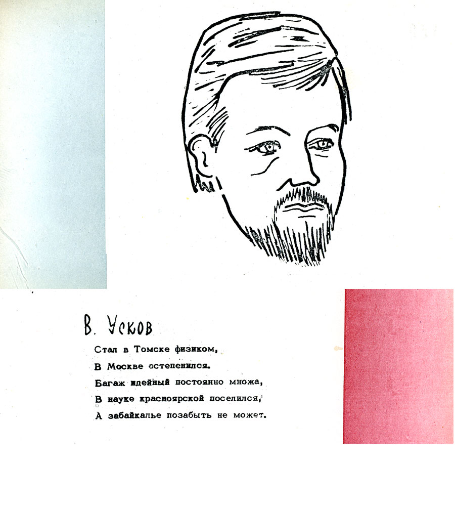 Усков В.В., старший научный сотрудник лаборатории физики магнитных явлений Института физики им. Л.В. Киренского Сибирского отделения Академии наук СССР (ИФ СО АН СССР). Рисунок сотрудника Института физики Баюкова О.А. 1972 год. Красноярск.