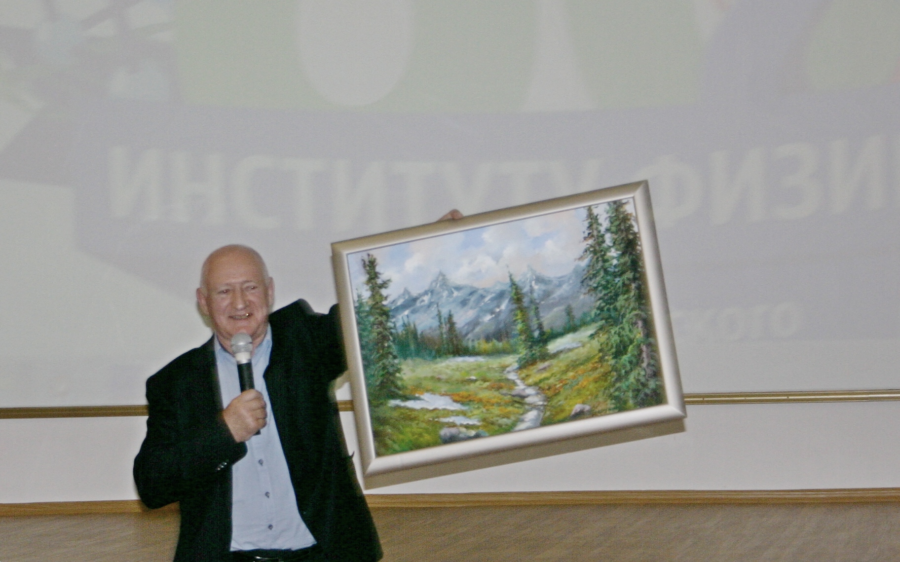 12 октября 2016 года. Конференц-зал Института физики им. Л.В. Киренского Сибирского отделения Российской академии наук (ИФ СО РАН). Состоялось расширенное заседание ученого Совета, посвященное 60-летию образования института с участием сотрудников института, представителей администраций города и края, директоров предприятий-партнеров, директоров подразделений Федерального исследовательского центра «Красноярский научный центр Сибирского отделения Российской академии наук» (ФИЦ КНЦ СО РАН) и других гостей. Поздравляет и вручает подарок институту заместитель директора ФИЦ КНЦ СО РАН Владимиров В.М. Красноярск.