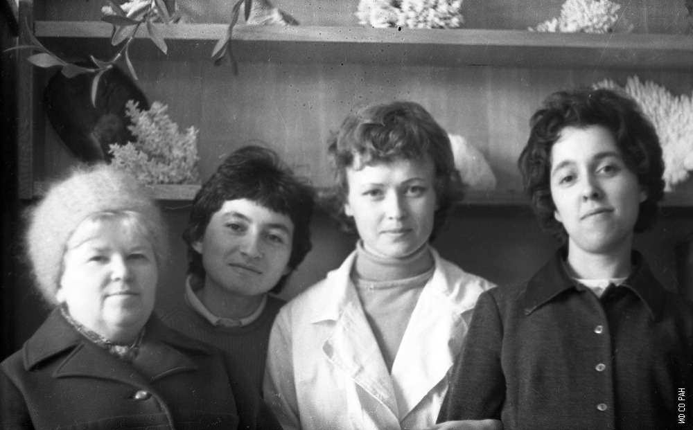 Сотрудники лаборатории биофизики Института физики им. Л.В. Киренского Сибирского отделения Академии наук СССР (ИФ СО АН СССР), слева направо: Воробьева Т.И., Щербакова (Дралюк) Г.Я., Бержанская Л.Ю., Попова Л.Ю., фото 1973 года. Красноярск.