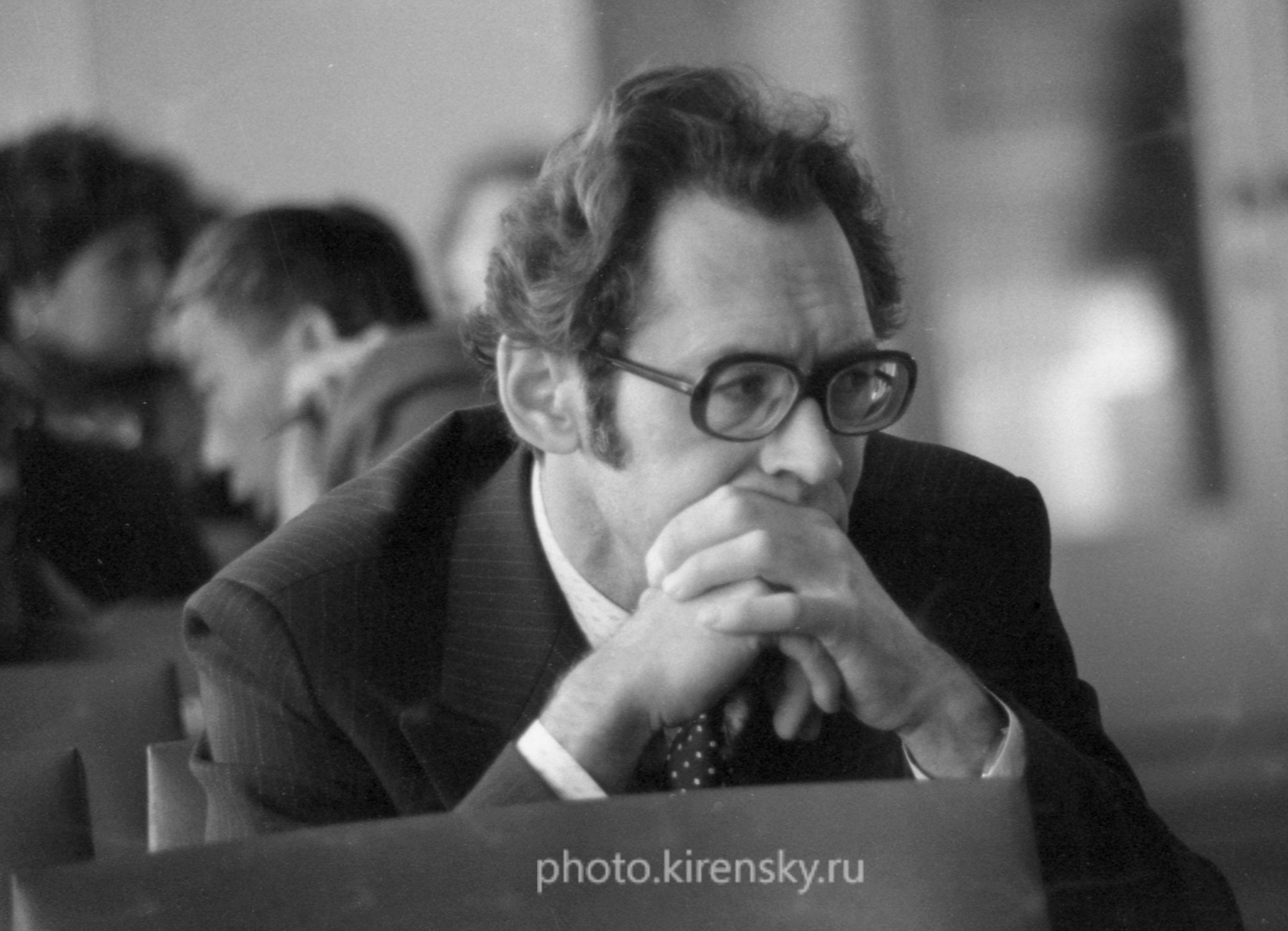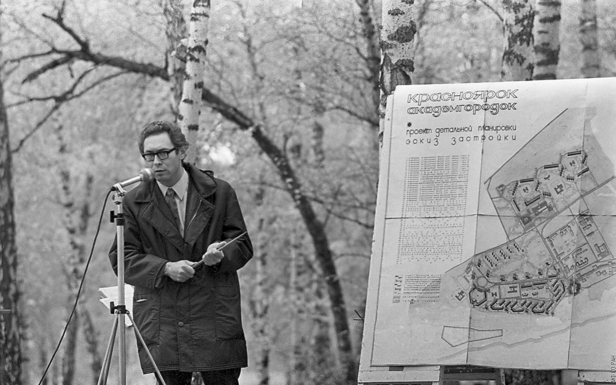 Перед жителями микрорайона «Академгородок», который появился в Красноярске в 1966 году, выступает Якубайлик Э. К., фото октябрь 1974 г.