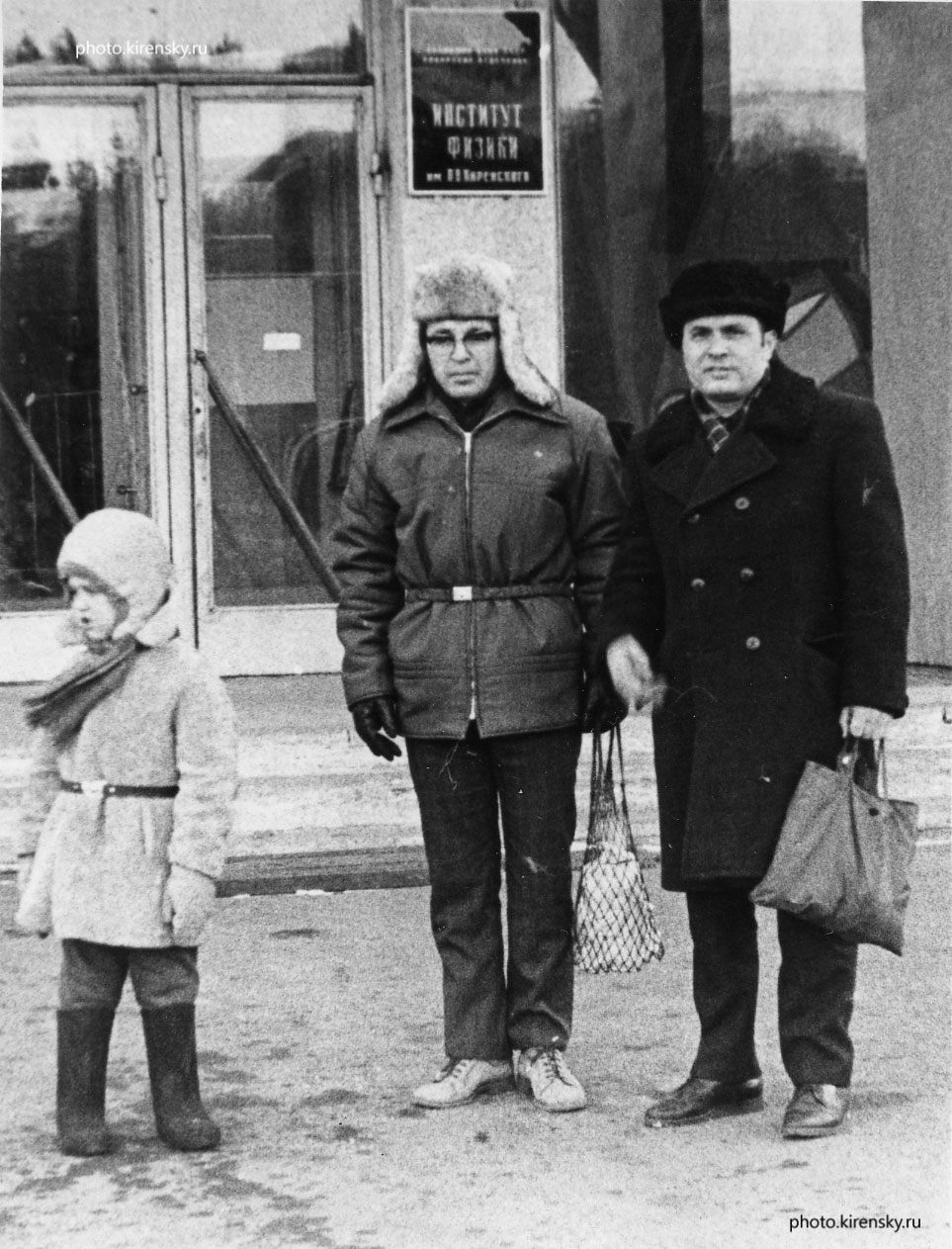1969 год. Академику Л.В. Киренскому, организатору и первому директору Института физики Сибирского отделения Академии наук СССР (ИФ СО АН СССР), было присвоено звание Героя Социалистического Труда. После вручения Ордена Ленина и золотой медали «Серп и молот» в Москве. Слева направо: Л. В. Киренский, И.А. Терсков, заместитель директора по научной работе Института физики, Ю.В. Захаров, ученый секретарь института.