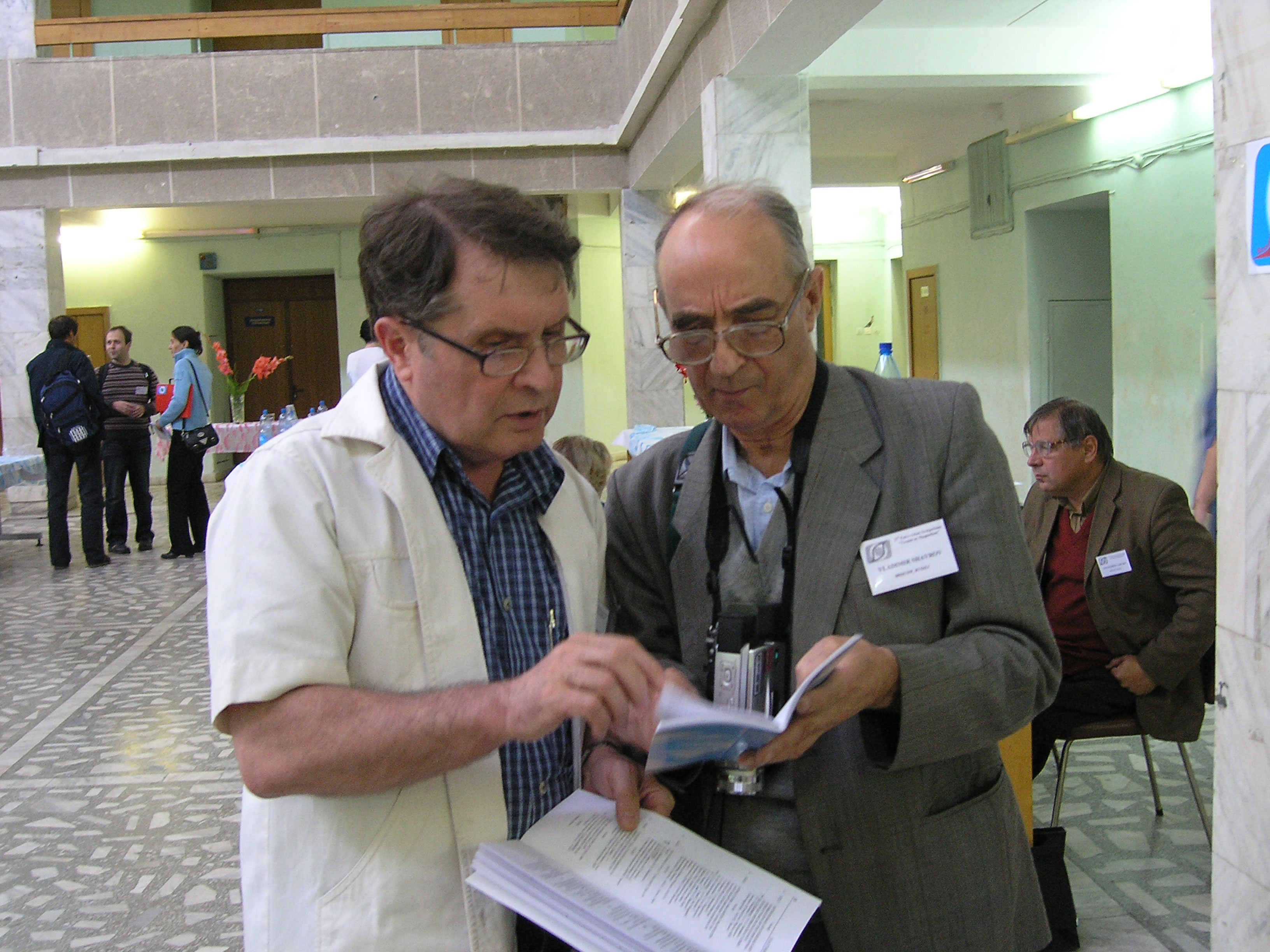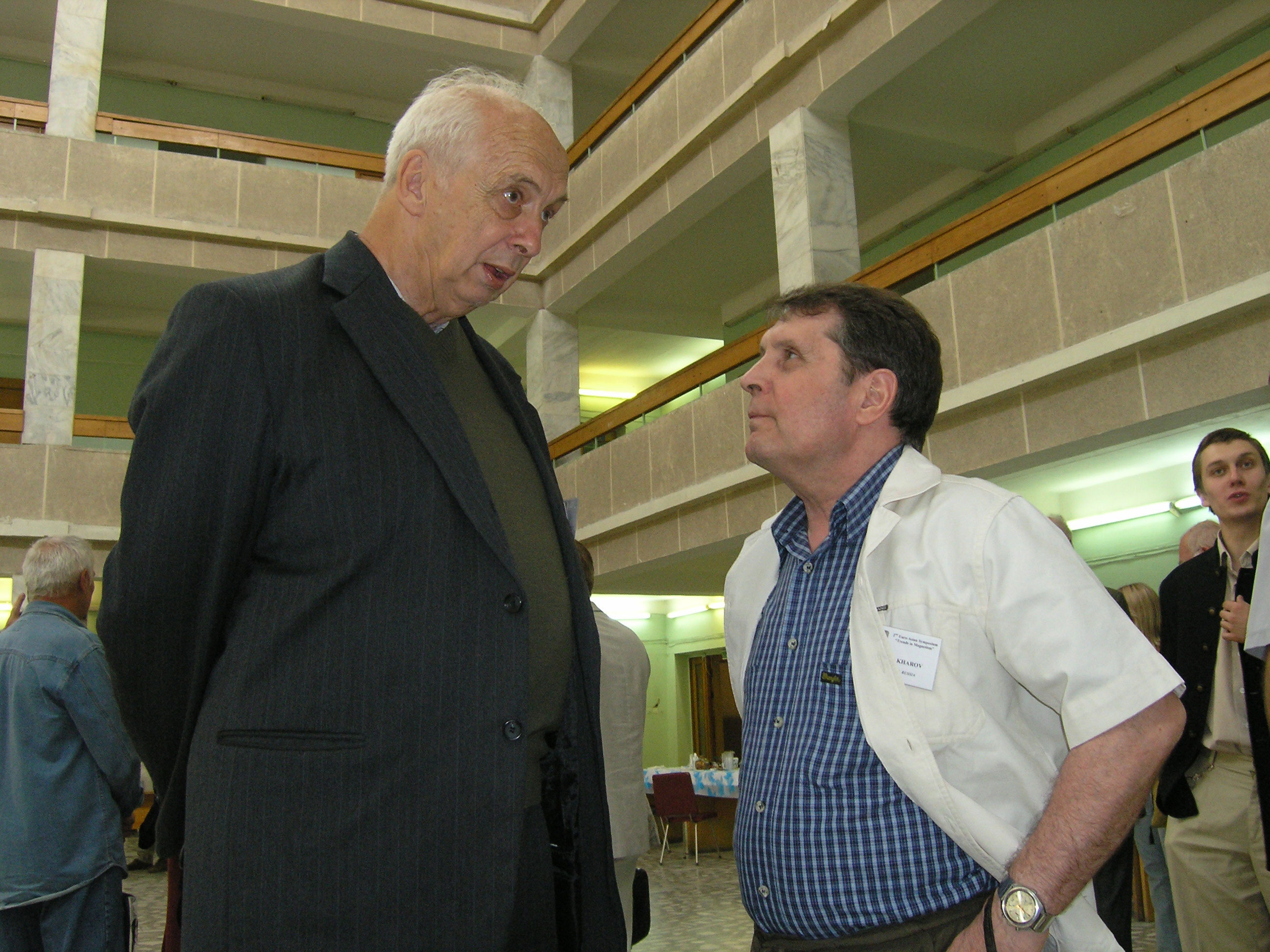 2004 год. 24-27 августа. Участники Евро-Азиатского симпозиума «Прогресс в магнетизме» (ЕASTMAG-2004) профессор В.Г Веселаго (заведующий лабораторией магнитных материалов Института общей физики имени А.М. Прохорова РАН, Москва) и профессор Ю.В. Захаров, ученый секретарь Института физики им. Л.В. Киренского Сибирского отделения Академии наук СССР с 1965 по 1972 год) . Красноярск.