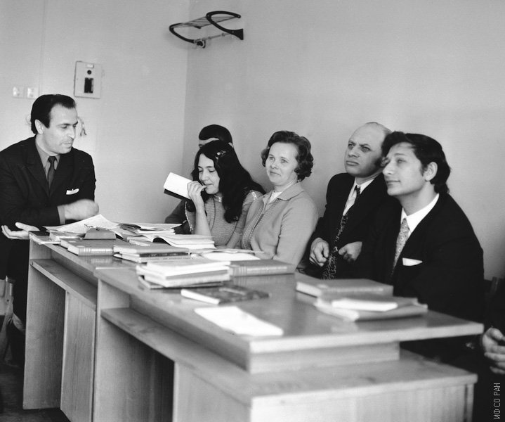 1976 год. Сотрудники Института физики им. Л.В. Киренского Сибирского отделения Академии наук СССР (СО АН СССР с 1991 года - СО РАН) на занятиях в группе по ускоренному изучению английского языка (кафедра иностранных языков института), слева направо: Фиш А.М., Александрова И.П., Зайцева М.П., Смолин Р.П., Бержанский В.Н. Красноярск.