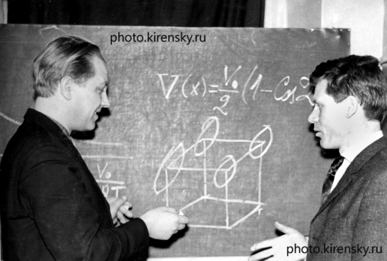 1965 год. На снимке старший научный сотрудник Бондарев А.Ф. (слева) и аспирант Жидков Л.Г., сотрудники лаборатории молекулярной спектроскопии Института физики Сибирского отделения Академии наук СССР (ИФ СО АН СССР) (СО АН СССР с 1991 года СО РАН), за обсуждением вопроса о потенциальных барьерах в молекулярных кристаллах. Красноярск.