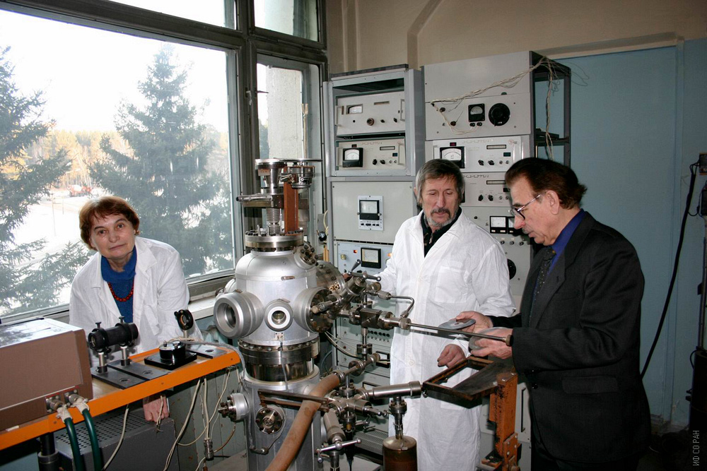 1989 год. Сотрудники сектора физики неоднородных сплавов Института физики им. Л.В. Киренского Сибирского отделения Академии наук СССР (ИФ СО АН СССР), слева направо: Чеканова Л.А., Жигалов В.С и Фролов Г.И. у установки для синтеза наноструктур на основе магнитных пленок. Красноярск.