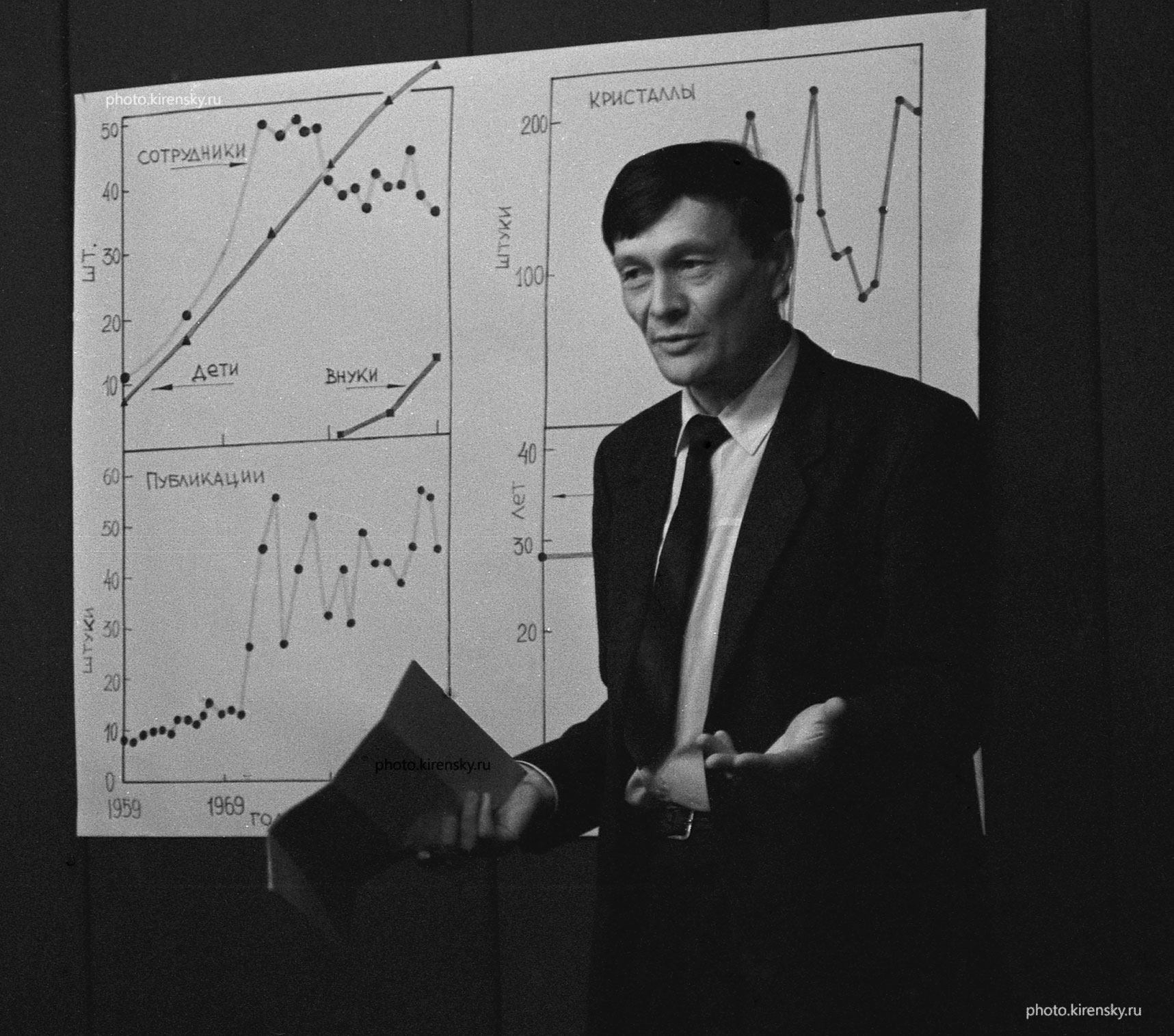 Зиненко Виктор Иванович, старший научный сотрудник Института физики им. Л.В. Киренского Сибирского отделения Академии наук СССР, на семинаре лаборатории кристаллофизики. Фото 1984 года.