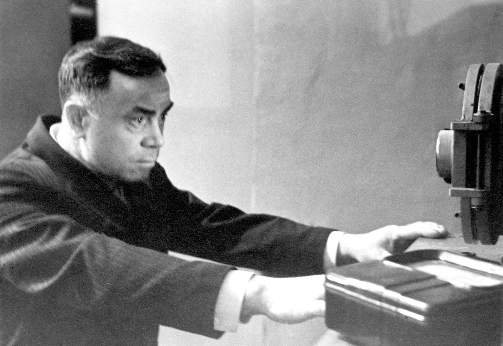 Зырянов Гаврила Иванович, старший инженер лаборатории магнитных материалов Института физики Сибирского отделения Академии наук СССР (ИФ СО АН СССР), специалист в области технологий для изготовления поли- и монокристаллических ферритов, за одной из установок для выращивания монокристаллических ферритов, фото 1962 года.