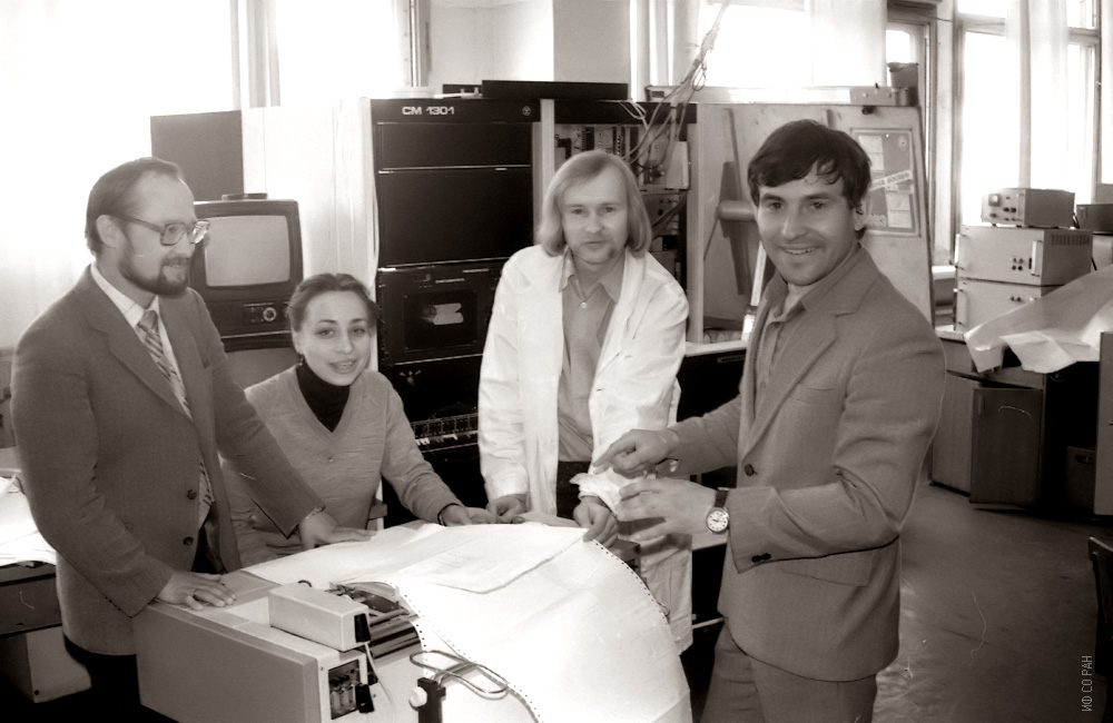 Cотрудники лаборатории молекулярной спектроскопии Института физики им. Л.В. Киренского Сибирского отделения Академии наук СССР (ИФ СО АН СССР). Слева направо: А.Н. Ботвич, Т.А. Позднякова, А.Н. Втюрин, Н.П. Шестаков, за обсуждением результатов исследований нелинейных оптических свойств кристаллов на фоне автоматизированной установки для изучения таких свойств, Снимок 1985 года. Красноярск.