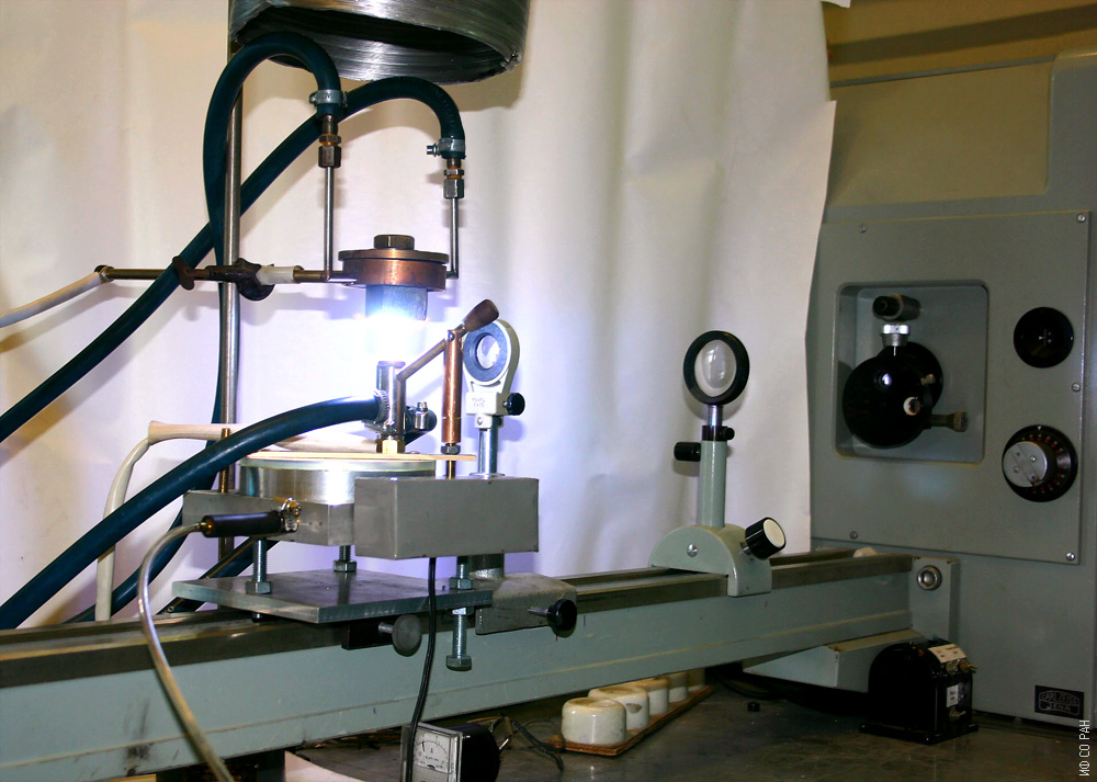 Применение ВЧ тока позволило осуществить дуговой разряд в потоке аргона диаметром всего 1,5 мм. На основе этого разряда разработан источник света для спектрального анализа. Источник света защищен российским патентом и является основным узлом установки для анализа порошковых и монолитных образцов, фото 2005 г.