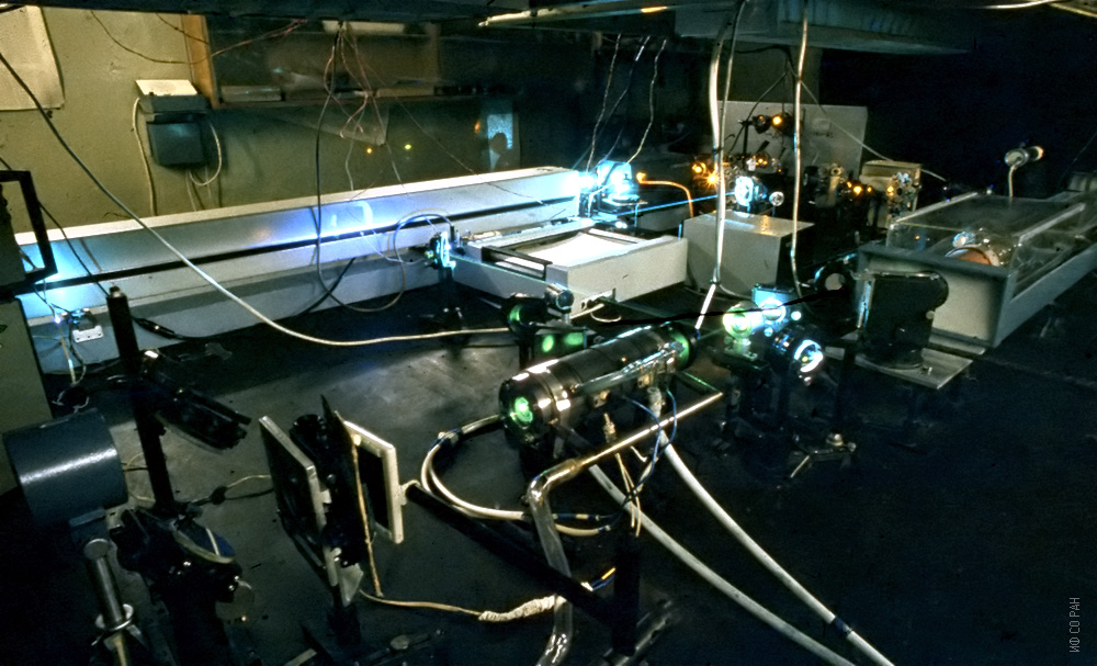 Эксперимент по апконверсии инфракрасного излучения в непрерывном режиме с использованием накачки лазерами SPECTRA PHYSICS MODEL 171 и COHERENT 375. Лаборатория когерентной оптики. Фото 1984 г.