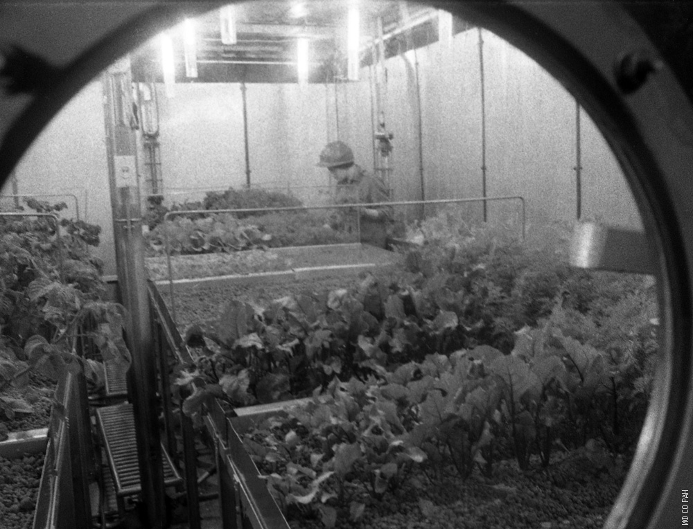 На фото запечатлена часть отсека со специальным набором овощных и зерновыми культур, обеспечивающих газо- и водообмен, в установке «БИОС-3» за счет интенсивного биосинтеза. Видно, что культуры высеваются не одновременно, но с разбегом по времени. Шиленко М.П. за работой на «огороде» - собирает урожай во время шестимесячного эксперимента в экспериментальной автономной экосистеме "Биос-3". Эксперимент проведен отделом биофизики Института физики им. Л.В. Киренского Сибирского отделения Академии наук СССР (ИФ СО АН СССР) в 1973 году. Фрагмент на видео https://youtu.be/X6XqUOP0nSs?t=181