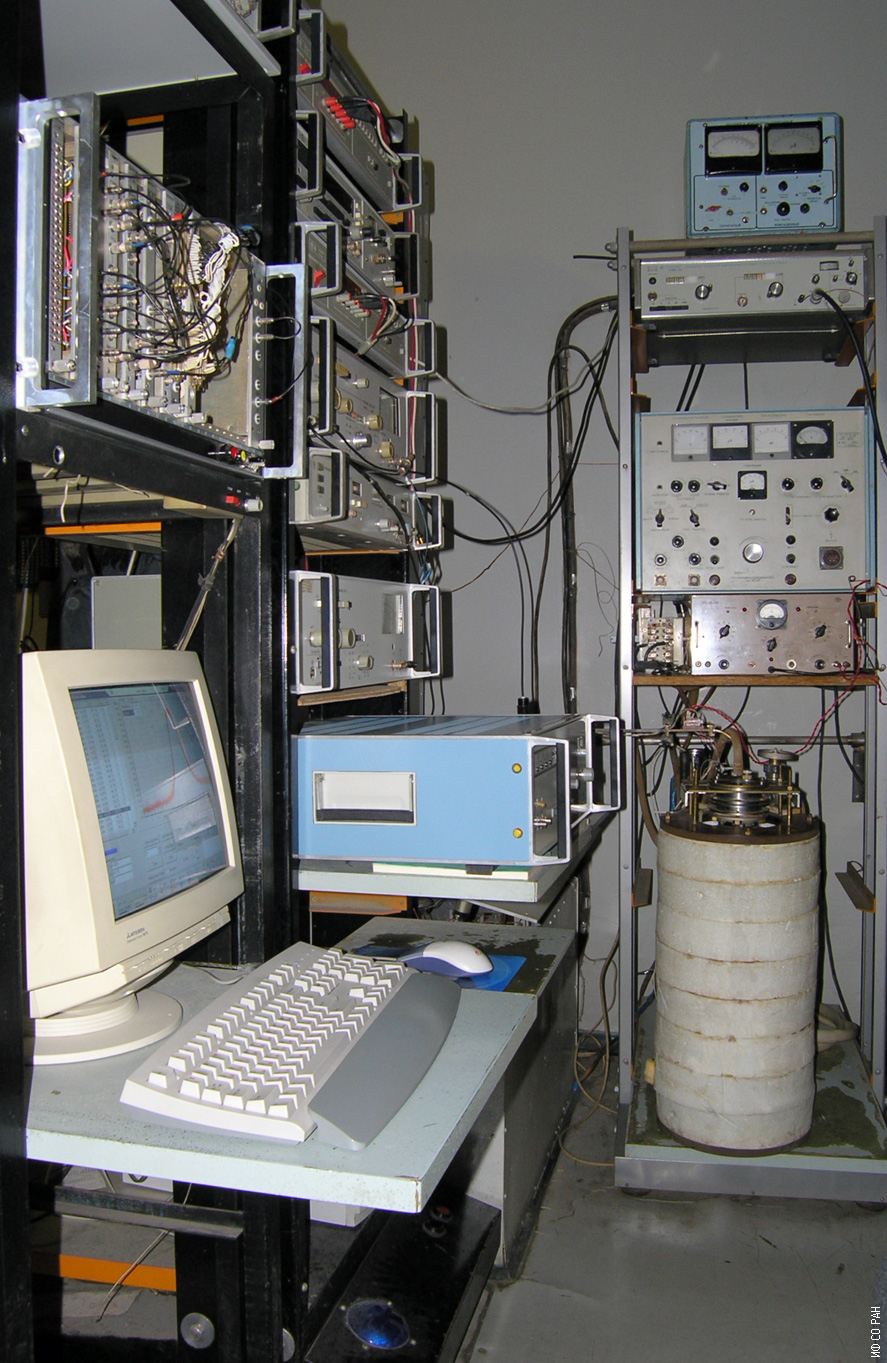Возможности серийных ЭПР-спектрометров, работающих на фиксированных частотах, для такого рода исследований ограниченны. Поэтому специально для исследований магнитного резонанса в магнитоупорядоченных веществах в Институте физики СО РАН был разработан автоматизированный спектрометр с широким диапазоном изменения резонансных частот и магнитных полей, работающий в интервале температур 4,2-400 К. Для получения магнитных полей напряженностью до 100 кЭ используется импульсный метод, широкий диапазон частот (25 – 140 ГГц) достигается за счет многомодового режима волновода, набора сменных генераторов и ламп обратной волны. Автоматизация спектрометра выполнена на базе высокоскоростной платы АЦП Е20-10 (L-Card).