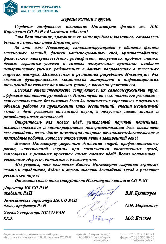 Поздравление от Института катализа им. Г.К. Борескова СО РАН
