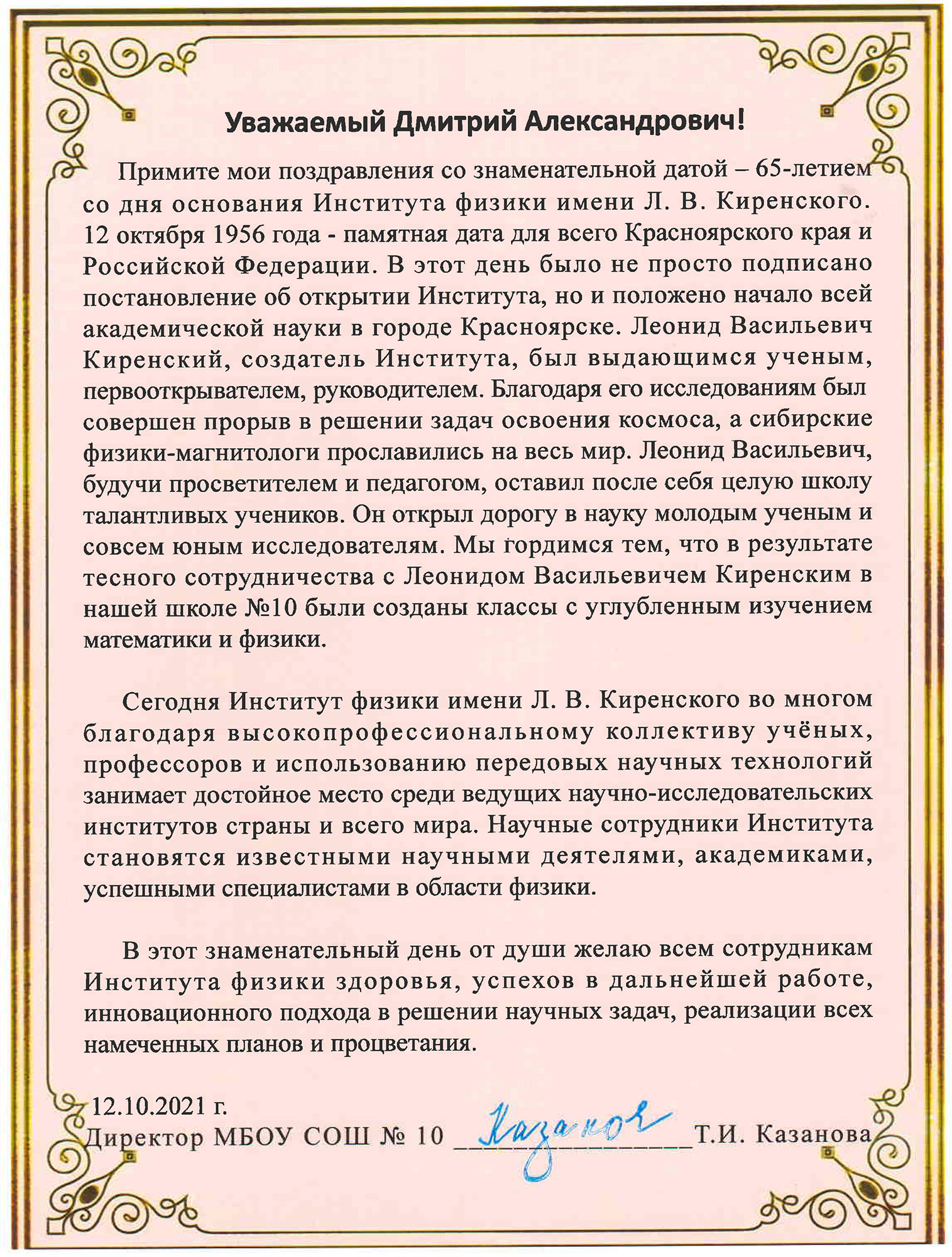 Вы здесь: Главная / События / Институту - 65 / Поздравление от МБОУ СОШ 10