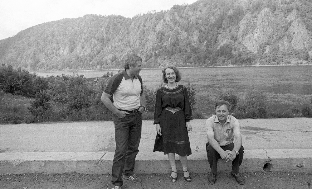 Института физики им. Л.В. Киренского Сибирского отделения Академии наук СССР (ИФ СО АН СССР) в 1986 году. На берегу Енисея, слева направо: участники семинара Ольков О.А., Мириакри Э.Г. из Москвы и Петраковский Г.А.