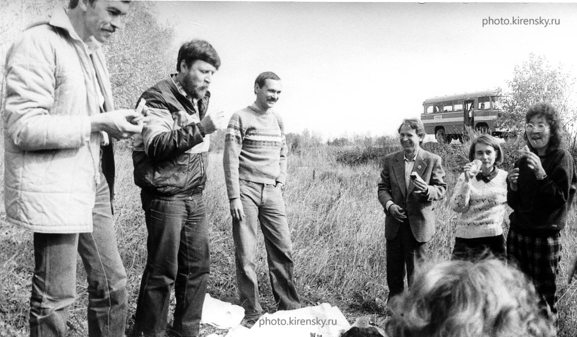 Слева направо: Поляков А.М., Розанов О.В., Черкасов Б.И., Серебренников В., Примак, Очирова В.Б., сотрудники Института физики им. Л.В. Киренского Сибирского отделения Академии наук СССР (ИФ СО АН СССР), на Международном симпозиуме-спутнике по ядерно-магнитному резонансу (ЯМР). Во время отдыха. Симпозиум был организован и проведен Институтом физики с 28 по 30 сентября 1987 года в поселке Шушенское Красноярского края.