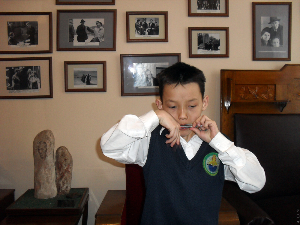 Птицын Виталий играет на хомусе, подаренном земляками Леониду Васильевичу в день его шестидесятилетия 9 апреля 1969 года и хранящегося в музее.