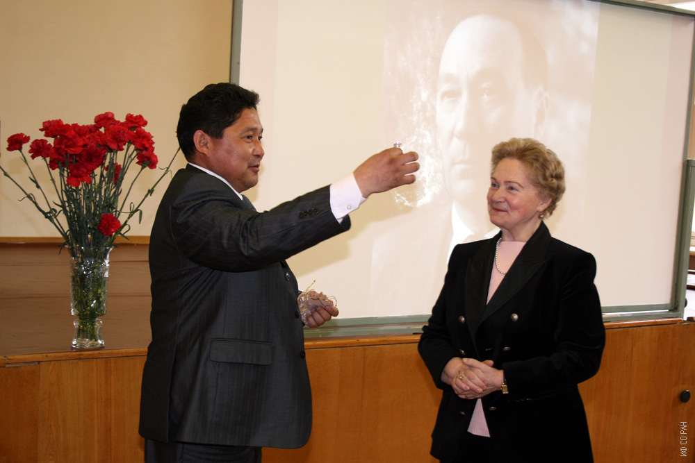 Глава муниципального образования "Амгинский улус (район)" Республики Саха (Якутия) А.Е.Артемьев вручает памятный подарок от администрации Амгинского улуса дочери Л.В.Киренского, 9 апреля 2009 г.