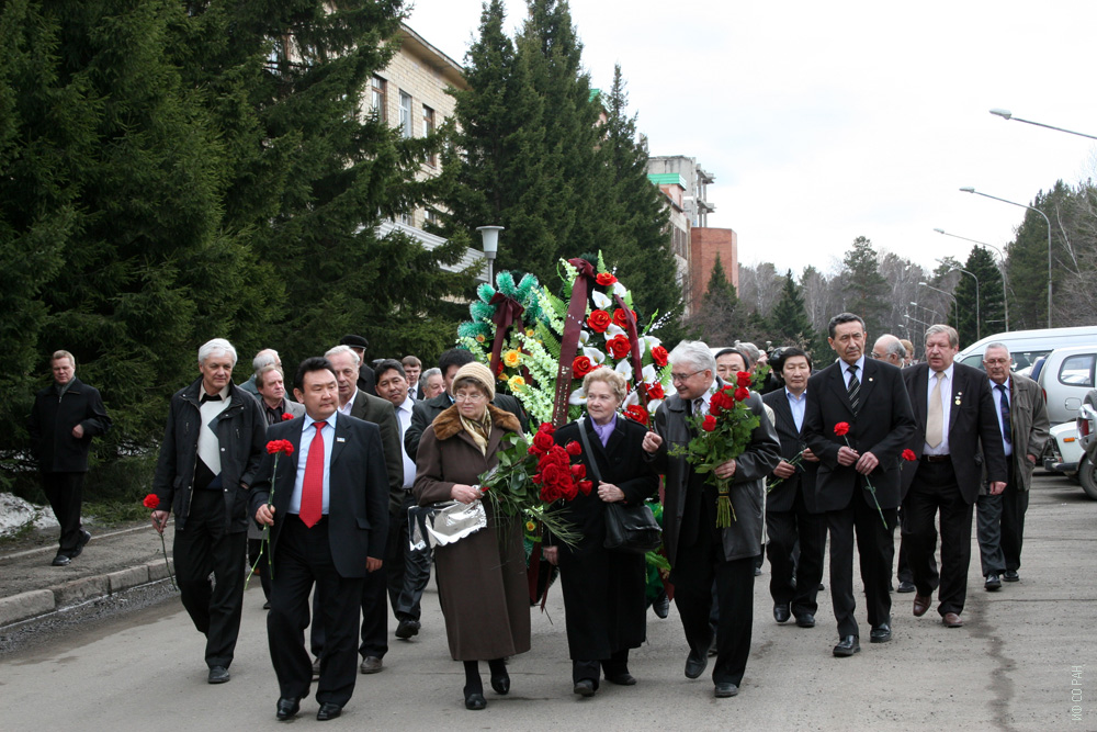 9 апреля 2009 года. Начало церемонии возложение венков и цветов на могилу академика Л.В. Киренского, организатора и первого директора Института физики им. Л.В. Киренского Сибирского отделения Российской академии наук (Леонид Васильевич похоронен в Академгородке Красноярск на территории института его имени). На переднем плане, слева направо: А. И. Панкрац, А. А. Пахомов, И. С. Эдельман, Т.Л. Овчинникова (Киренская), академик В. Ф. Шабанов, А.В. Мигалкин, И. И. Колодезников, В. В. Москвичев, В. А. Игнатченко, 9 апреля 2009 года.