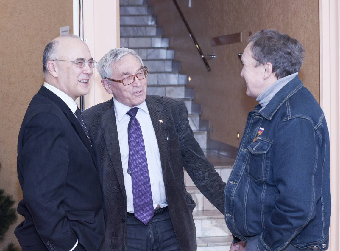 Слева направо: Корец А.Я., Рубайло А.И. и Ермаков В.П. на семинаре отдела оптики Института физики им. Л.В. Киренского Российской академии наук (ИФ СО РАН), посвящённом 100- летнему юбилею Коршунова А.В., организатора и руководителя отдела оптики института. Академгородок Красноярска, Дом ученых, 13 января 2011 года
