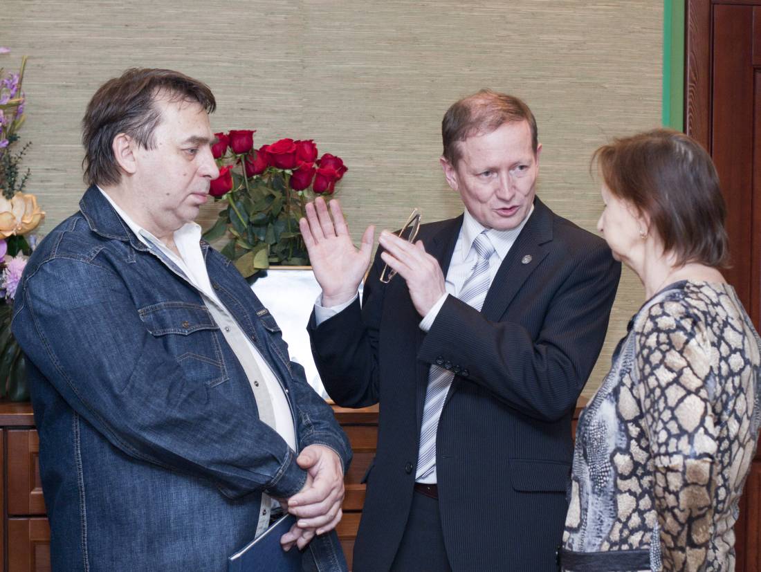 Слева направо: Коршунов М.А., Шефер А.Д., Коршунова Н.Д. на семинаре отдела оптики, посвящённом 100 летнему юбилею Коршунова А.В., Дом ученых, январь 2011 г.