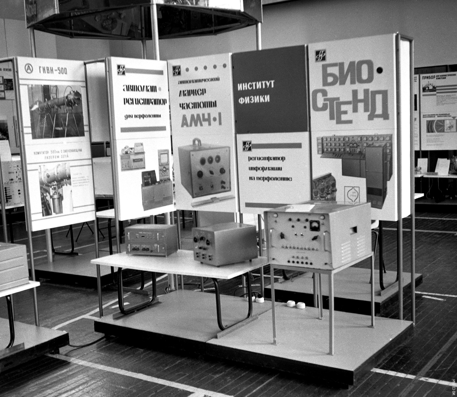 Стенд Института физики на зональной выставке в Новосибирске в 1971 году. Представлены приборы, разработанные сотрудниками и изготовленные в экспериментальных механических мастерских института.