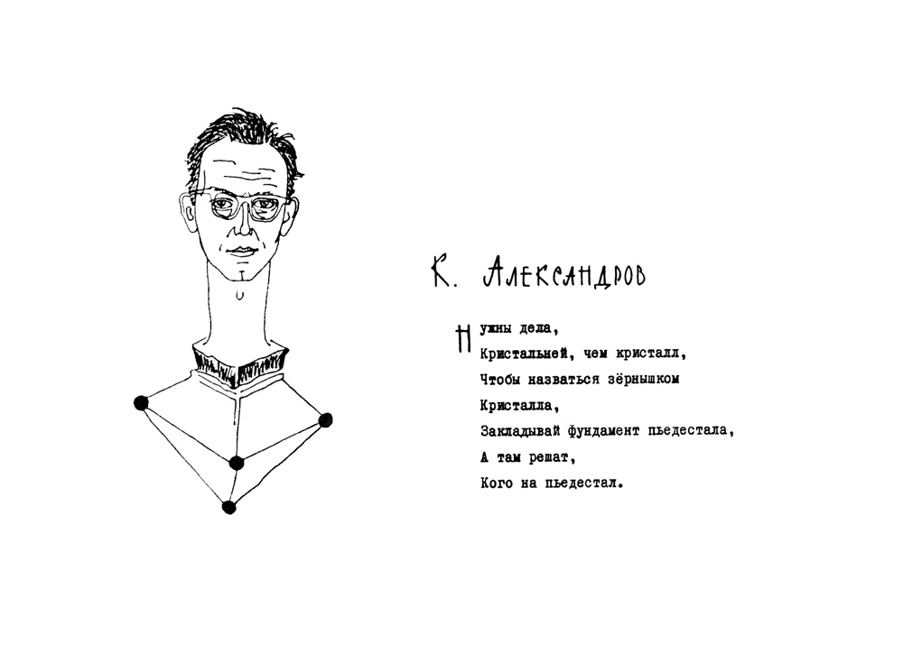 1967 год. К 10-летию образования Института физики Сибирского отделения Академии наук СССР (ИФ СО АН СССР) вышла первая часть книги дружеских шаржей "Музей друзей". Авторами ее являются научные сотрудники института О.А. Баюков и Н.С. Чистяков. Книга вышла малым тиражом (всего 100 экземпляров) и моментально разошлась среди сотрудников и была подарком авторов к юбилею института. Дружеский шарж К.С. Александрова, заведующего лабораторией кристаллофизики. Красноярск.