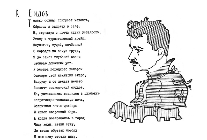 Дружеский шарж Ершова Р.Е. из книги шаржей и эпиграмм"Музей друзей", первая часть которой вышла в 1967 году. Авторами ее являются научные сотрудники института О.А. Баюков и Н.С. Чистяков. Книга вышла малым тиражом (всего 100 экземпляров) и моментально разошлась среди персонажей книги, сотрудников и была подарком авторов к юбилею института.
