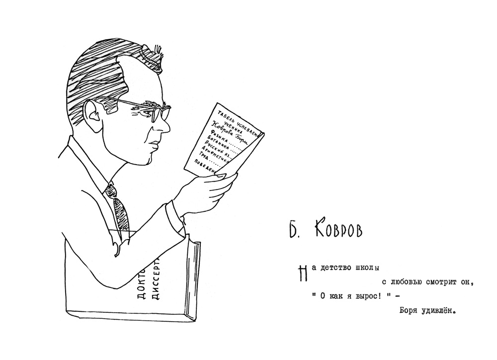 Дружеский шарж Коврова Б.Г. из книги шаржей и эпиграмм "Музей друзей", первая часть которой вышла в 1967 году. Авторами ее являются научные сотрудники института О.А. Баюков и Н.С. Чистяков. Книга вышла малым тиражом (всего 100 экземпляров) и моментально разошлась среди персонажей книги, сотрудников и была подарком авторов к юбилею института.