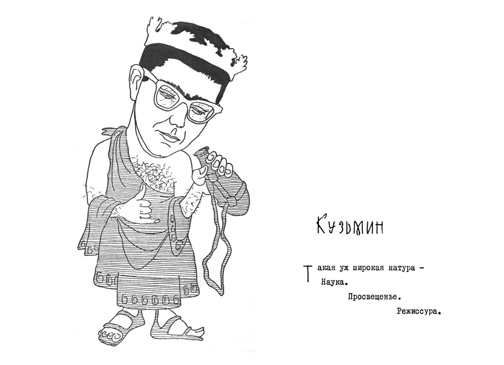 Дружеский шарж Кузьмина Е.В. из книги шаржей и эпиграмм"Музей друзей", первая часть которой вышла в 1967 году. Авторами ее являются научные сотрудники института О.А. Баюков и Н.С. Чистяков. Книга вышла малым тиражом (всего 100 экземпляров) и моментально разошлась среди персонажей, сотрудников и была подарком авторов к юбилею института.