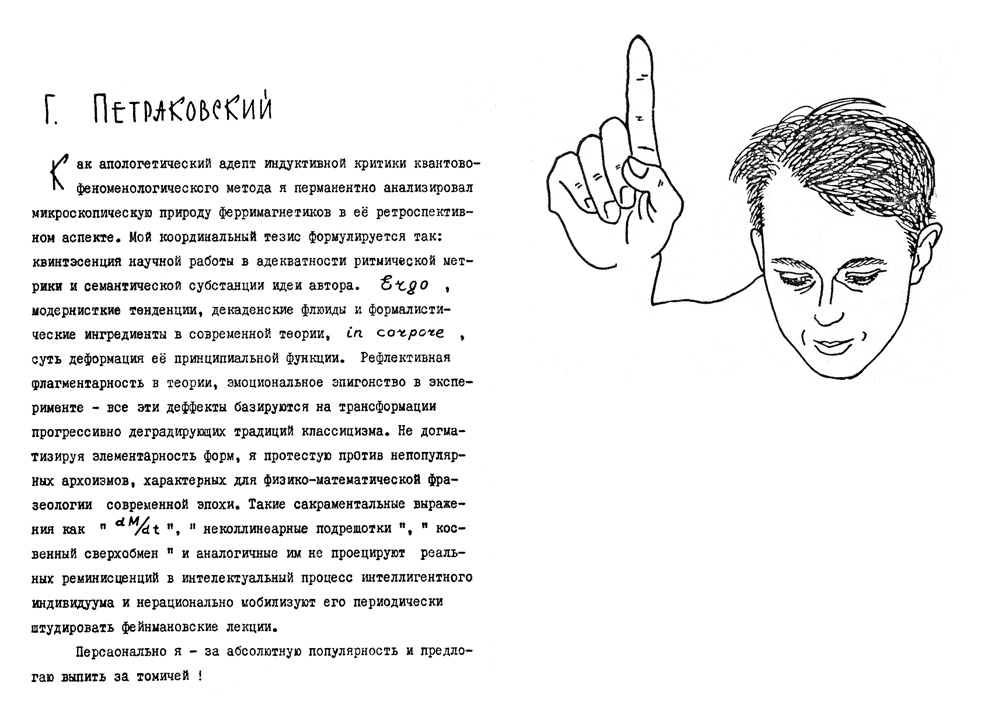 Дружеский шарж из книги шаржей и эпиграмм"Музей друзей", первая часть которой вышла в 1967 году. Авторами ее являются научные сотрудники института О.А. Баюков и Н.С. Чистяков. Книга вышла малым тиражом (всего 100 экземпляров) и моментально разошлась среди персонажей книги, сотрудников и была подарком авторов к юбилею института.